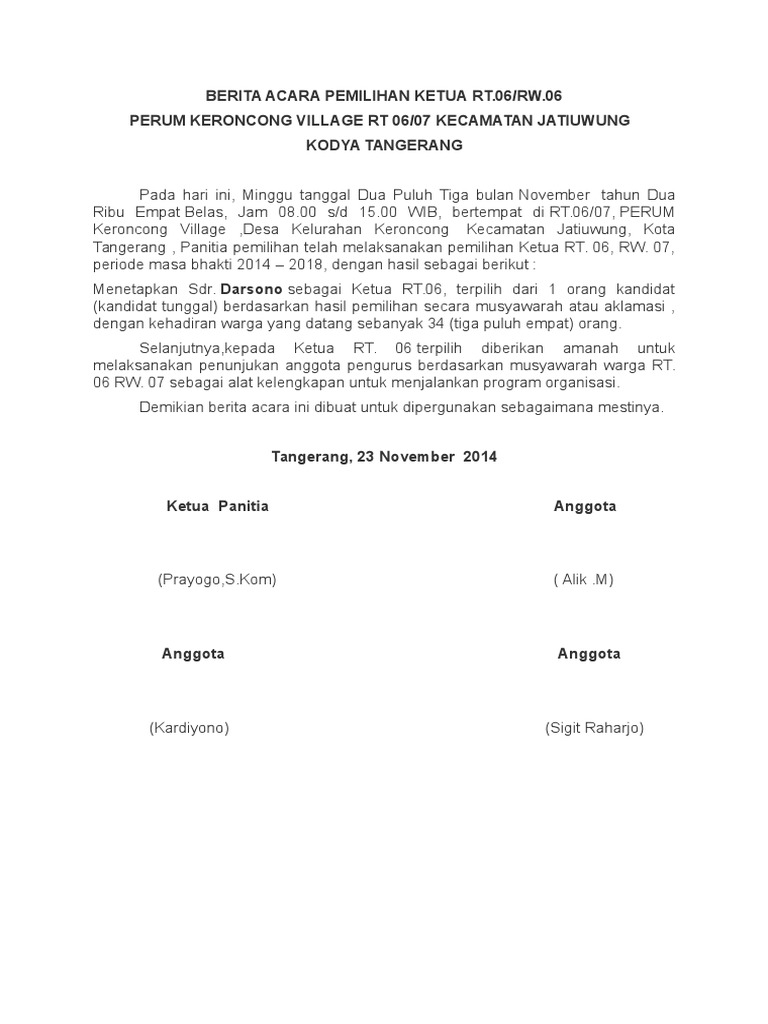Surat berita acara pemilihan rt. Pada hari kamis, 12 mei 2016 di gedung diklat rsj ghrasia. Jumlah pemilih yang hadir menggunakan hak suara : Pemilihan langsung ketua rt 007/08 kel. Demikian berita acara kompensasi penggalian tanah saluran limbah perumahan bumi.